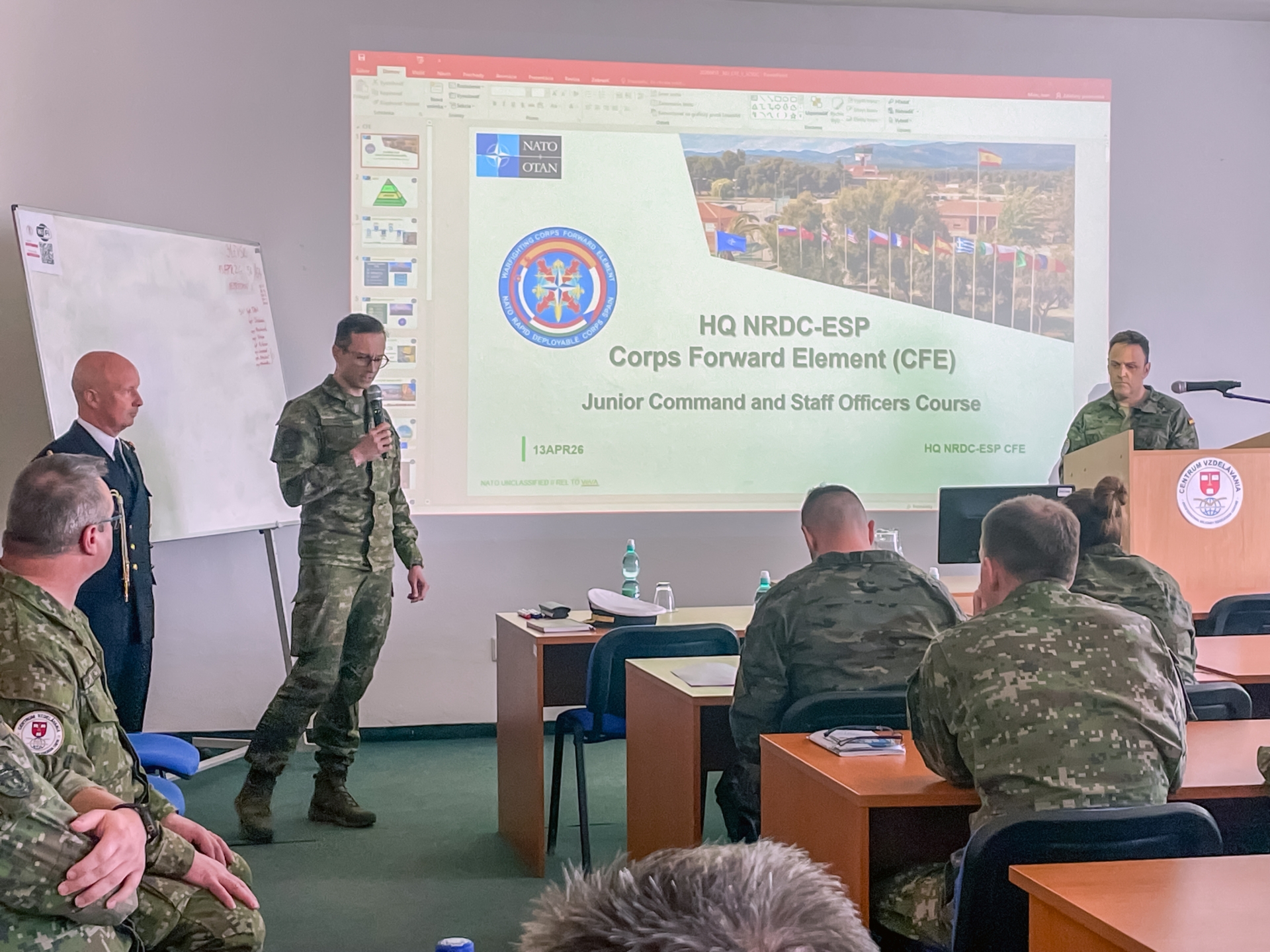 Atmosphere full of stimulating ideas, discussions, and inspiring meetings filled the Professional Military Training Center (PMEC) of the Armed Forces Academy of GEN M. R. Stefanik on April 13th, 2026. The 31st Junior Command and Staff Officers’ Course was enriched by the visit of members of the Spanish contingent of the Armed Forces of the Kingdom of Spain, who have been stationed in the territory of the Slovak Republic. Military attaché of the Kingdom of Spain to the Slovak Republic, COL Francesco Martinez, was a part of the delegation and presented the current security challenges and their consequences for the troops of NATO countries deployed on the eastern wing of the Alliance.